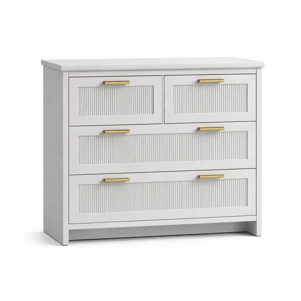 Questa cassettiera è realizzata in MDF con maniglie in metallo dorato.