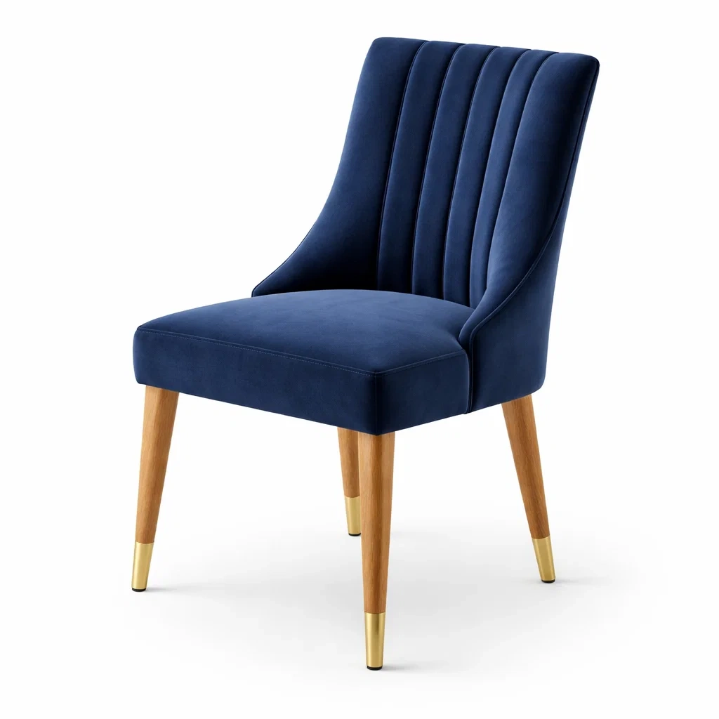Sedia da pranzo in legno e velluto blu con dettagli in ottone