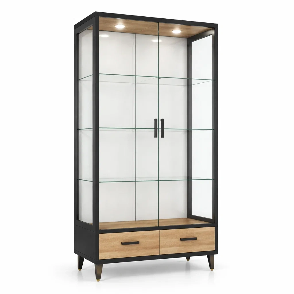 Questa vetrina presenta una struttura in metallo con vetro temperato da 6 mm e pannelli in legno MDF. È dotata di luci integrate e offre ampio spazio di stoccaggio grazie ai suoi ripiani regolabili.